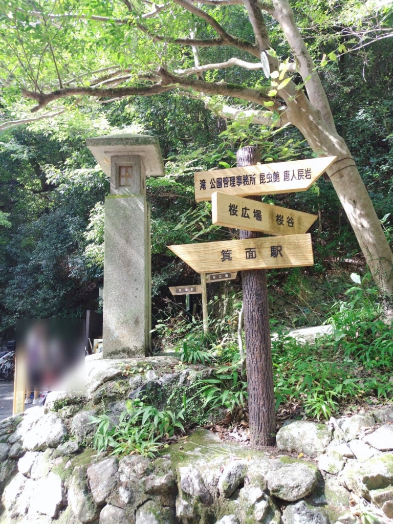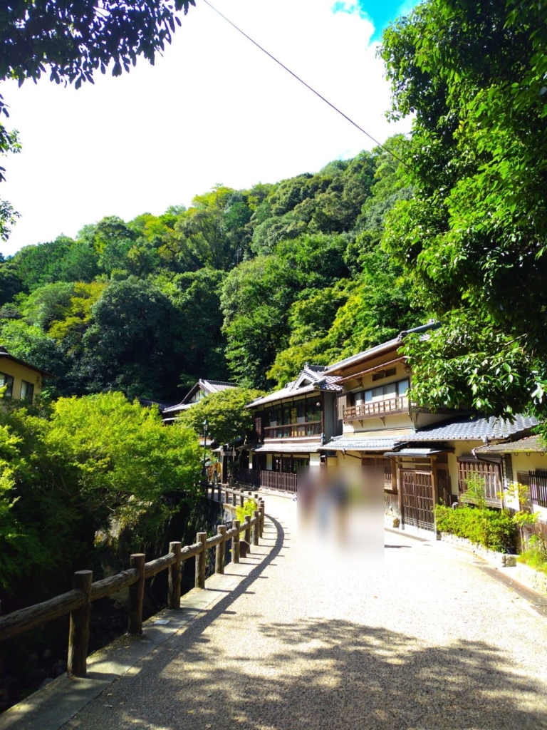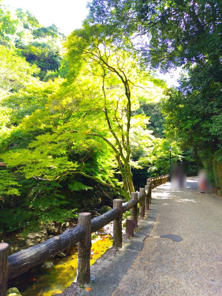 最寄りの箕面(みのお)駅から「箕面の滝」までは歩いて約40~50分です。遊歩道は「滝道」として整備されており、ベビーカーを押す家族や犬の散歩をする人など、滝から流れる小川に沿って景色を楽しみながら歩くことができます。