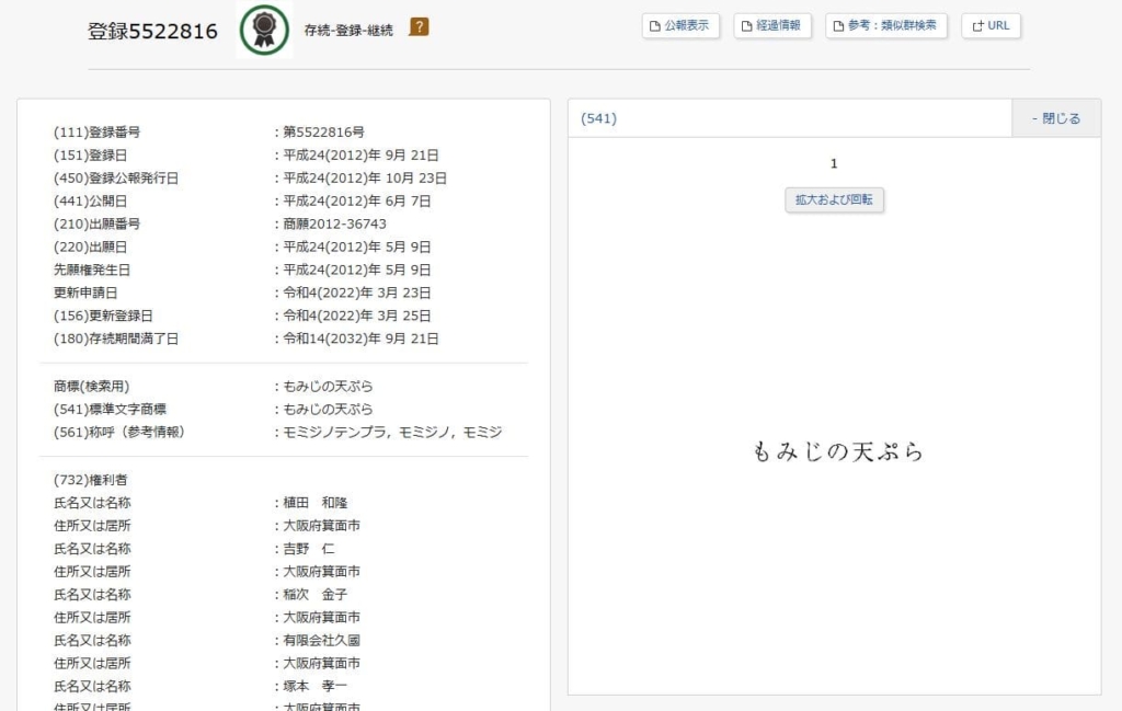 「もみじの天ぷら」は商標出願されており、【商品及び役務の区分並びに指定商品又は指定役務】第30類:揚げ菓子、で登録されています(商標登録第5522816号)。
